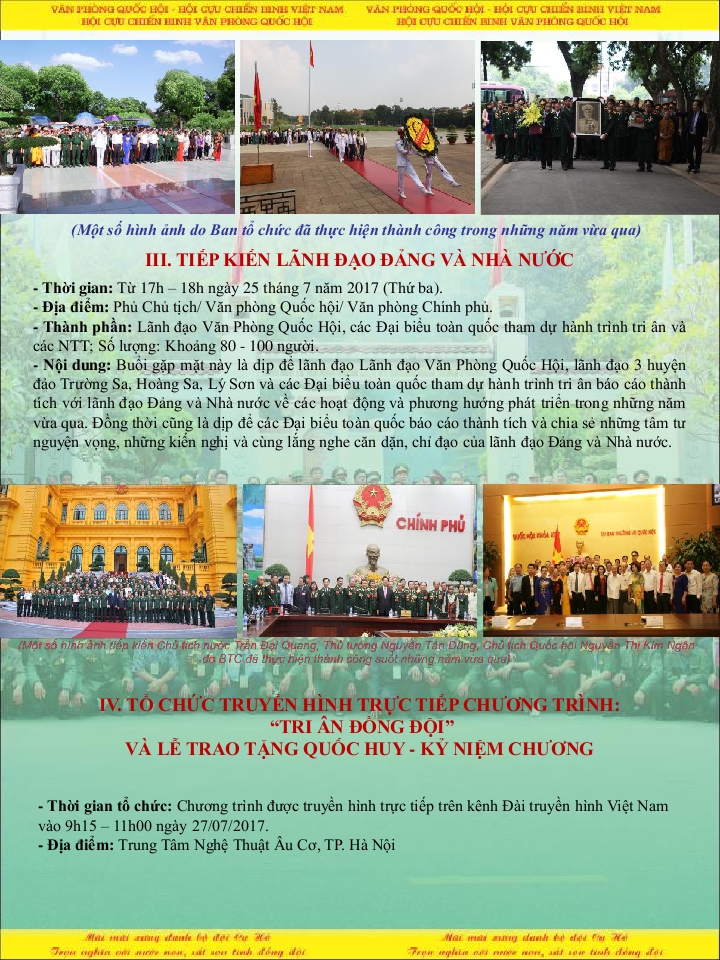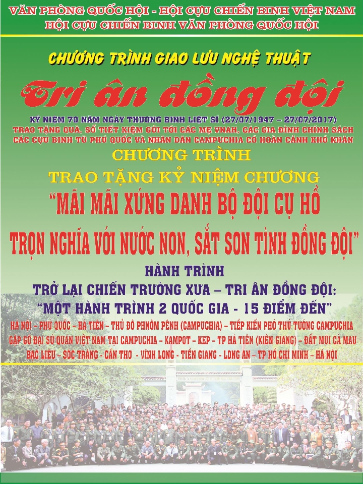 Nhân dịp kỷ niệm 70 năm ngày Thương binh, Liệt sỹ Việt Nam (27.07. 1947 – 27.07.2017 ) và 50 năm ngày thiết lập quan hệ ngoại giao Việt Nam – Campuchia ( 24.06.1967 – 24.06.2017 ) Hội Tân Trào tại CHLB Đức nhận được thư mời tham dự chương trình „ TRI ÂN ĐỒNG ĐỘI „ do Văn Phòng Quốc Hội, Hội Cựu chiến binh Văn phòng Quốc Hội tổ chức .