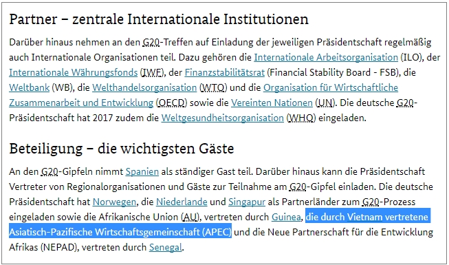 Đoàn Việt Nam được mời đến Đức để dự G20 với tư cách đại diện luân phiên của cộng đồng Kinh tế châu Á-Thái Bình Dương (APEC) : https://www.g20.org/Webs/G20/DE/G20/Teilnehmer/teilnehmer_node.html