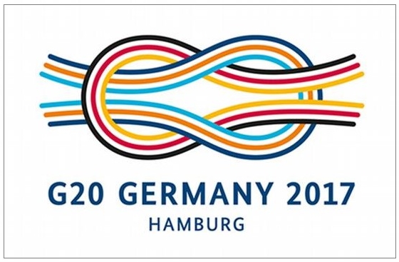 Lưu ý : những lá cờ được dựng ở cuối phòng, trong đó lá cờ in biểu tượng của Hội nghị Thượng Đỉnh G20 lần này ở Hamburg, chỉ được dùng cho việc họp bàn những việc phục vụ G20.
