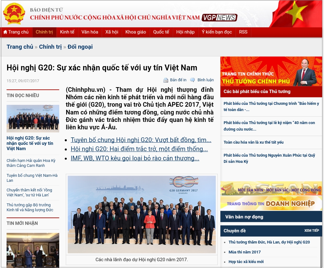 Đáng chú ý nhất là sau khi Hội nghị kết thúc, ngày 09/07/2017 tờ Báo điện tử Chính phủ (kênh cung cấp thông tin chính thống của Chính phủ mà người đứng đầu là Thủ tướng Nguyễn Xuân Phúc) đăng một bài báo với tựa đề „Hội nghị G20: Sự xác nhận quốc tế với uy tín Việt Nam“: