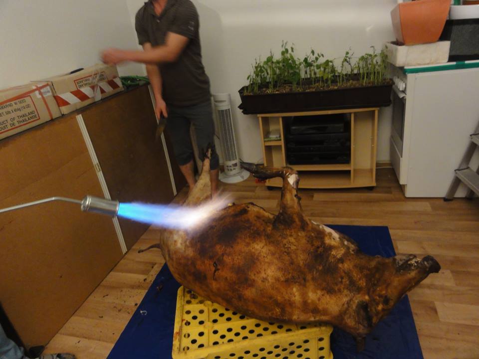 Viele 11 kg-Gasflaschen mit Abflammgerät, die eigentlich für den Bau bestimmt sind, werden zum schnellsten Werkzeug, um die restlichen Haare von der Schweinehaut zu entfernen. Frauen und Kinder rufen Freudenschreie, als sie der Schlachtung in einer Berliner Plattenbauwohnung beiwohnen.