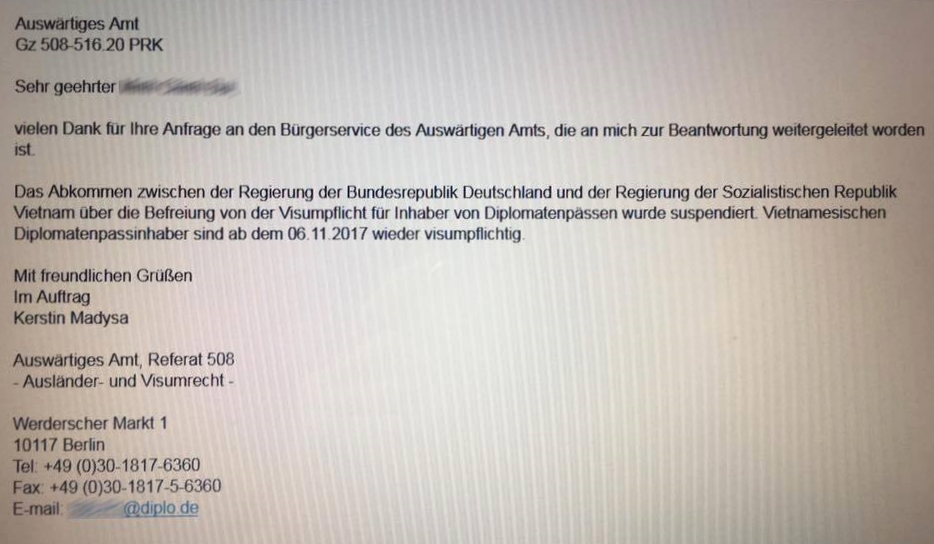 (EXKLUSIV, nur auf Vietnamesisch) Auswärtiges Amt bestätigt: Bundesregierung hebt deutsch-vietnamesisches Abkommen über die Befreiung von der Visumspflicht für Inhaber von Diplomatenpässen auf: