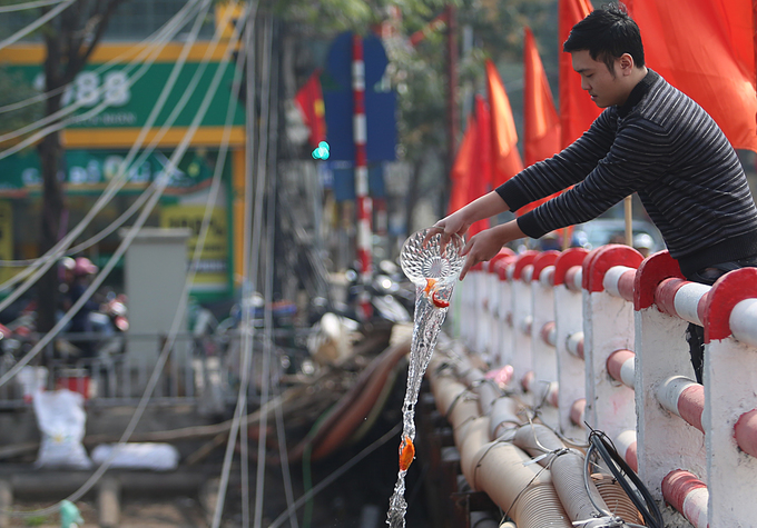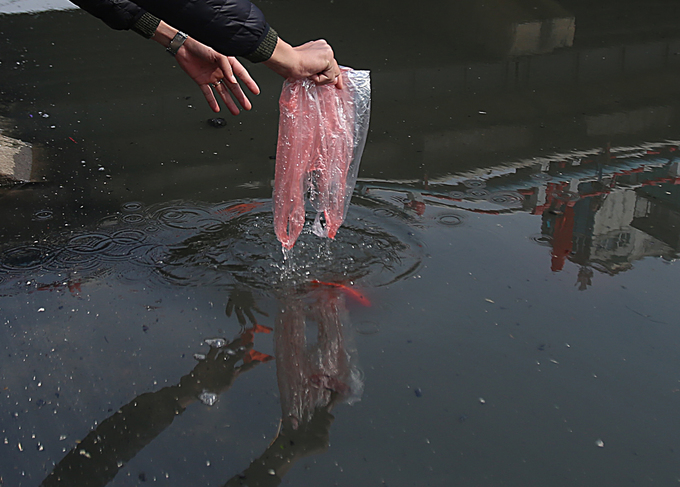 Các điểm dọc phố Khương Đình, Kim Giang, Ngã Tư Sở,… được nhiều người dân chọn là nơi thả cá chép tiễn Táo quân về trời.